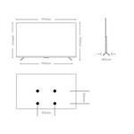 TV ima kovinski okvir in dvojno stojalo v barvi Dark Gray, kar zagotavlja stabilnost in premium videz. Dimenzije brez stojala so 1111 × 73 × 643 mm, z osnovo pa 1111 × 280 × 700 mm. Teža znaša 7,3 kg brez stojala in 7,4 kg s stojalom. Podpira stensko montažo 100 × 200 mm.