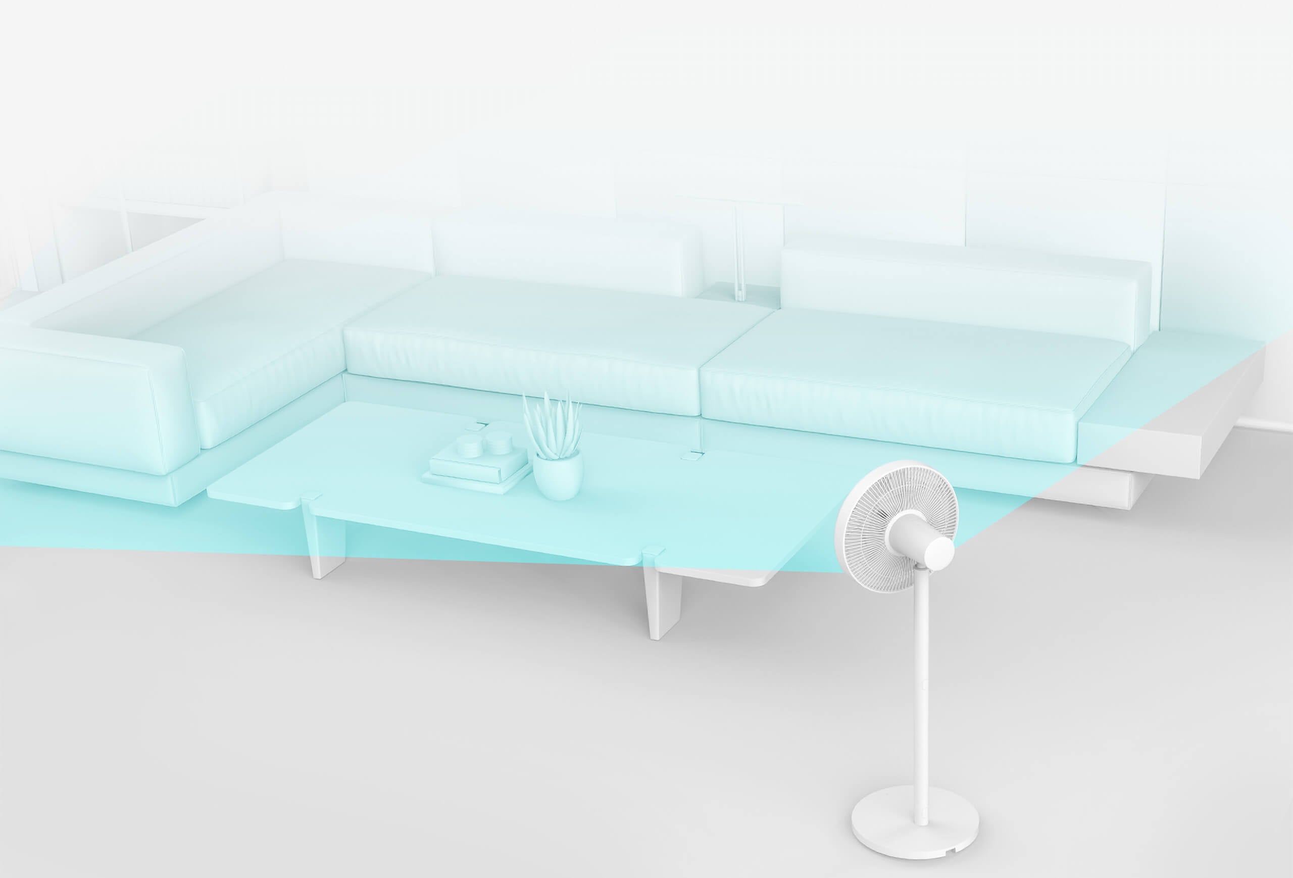 Sedem posebej oblikovanih lopatic ventilatorja omogoča potiskanje zraka vse do razdalje 14 metrov. To omogoča kroženje zraka v prostornini do 20 m3 na minuto. Ventilator ponuja dva načina – standardni in naravni veter, ki naredi pihanje bolj neenakomerno nežno in razpršeno. V standardnem načinu lahko nastavite 100 različnih hitrosti vrtenja, da lahko pihanje res natančno prilagodite svojim potrebam.  Seveda obstaja tudi samodejna vodoravna rotacija v območju 140° in pa nastavitev naklona ±39°.