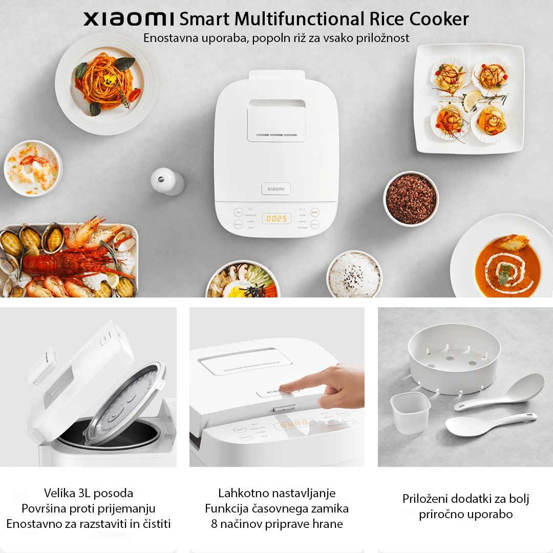 Xiaomi Smart Multifunctional Rice Cooker je multifunkcijska naprava za kuhanje okusnih in aromatičnih jedi. Xiaomi kuhalnik za riž ponuja 8v1 funkcionalnost, tako ste samo en dotik oddaljeni od vseh jedi, ki jih imate radi. Delovanje z enim dotikom vključuje praktične dnevne recepte, kar pomeni, da kuhanje še nikoli ni bilo lažje ali bolj priročno. Načini priprave vključujejo, način za riž, rjavi riž, riževo kašo, način za kuhanje s paro, pogrevanje, ohranjanje temperature in zakasnjen vklop.
