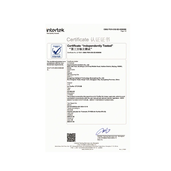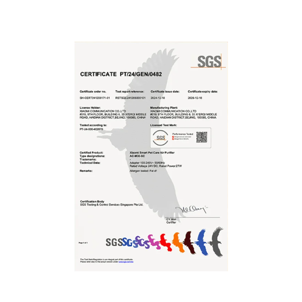 Zračni čistilec je uradno testiran in certificiran s strani mednarodnih inštitutov (SGS in ITS), kar zagotavlja varno uporabo tudi za alergikom občutljive osebe in njihove ljubljenčke.