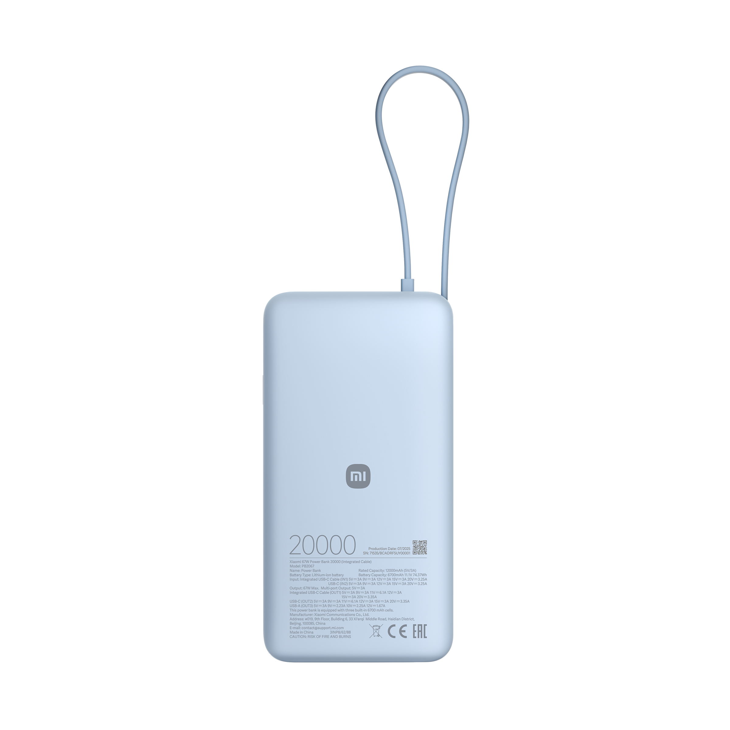 Xiaomi 67W Power Bank 20000 (Integrated Cable) vsebuje tri vgrajene celice po 6.700 mAh, kar zagotavlja nazivno kapaciteto 12.000 mAh (5 V/3 A) in nazivno energijo 74,37 Wh. V skladu z mednarodnimi letalskimi standardi so power banki z nazivno energijo pod 100 Wh običajno dovoljeni na letalih. Dejanska uporaba je odvisna od pravil posamezne letalske družbe.