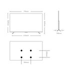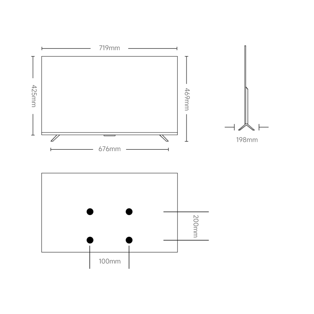 TV ima kovinski okvir in dvojno stojalo v barvi Dark Gray, kar zagotavlja stabilnost in premium videz. Dimenzije brez stojala so 719 × 61 × 425 mm, z osnovo pa 719 × 198 × 469 mm. Teža znaša 3,1 kg brez stojala in 3,2 kg s stojalom. Podpira stensko montažo 100 × 200 mm.