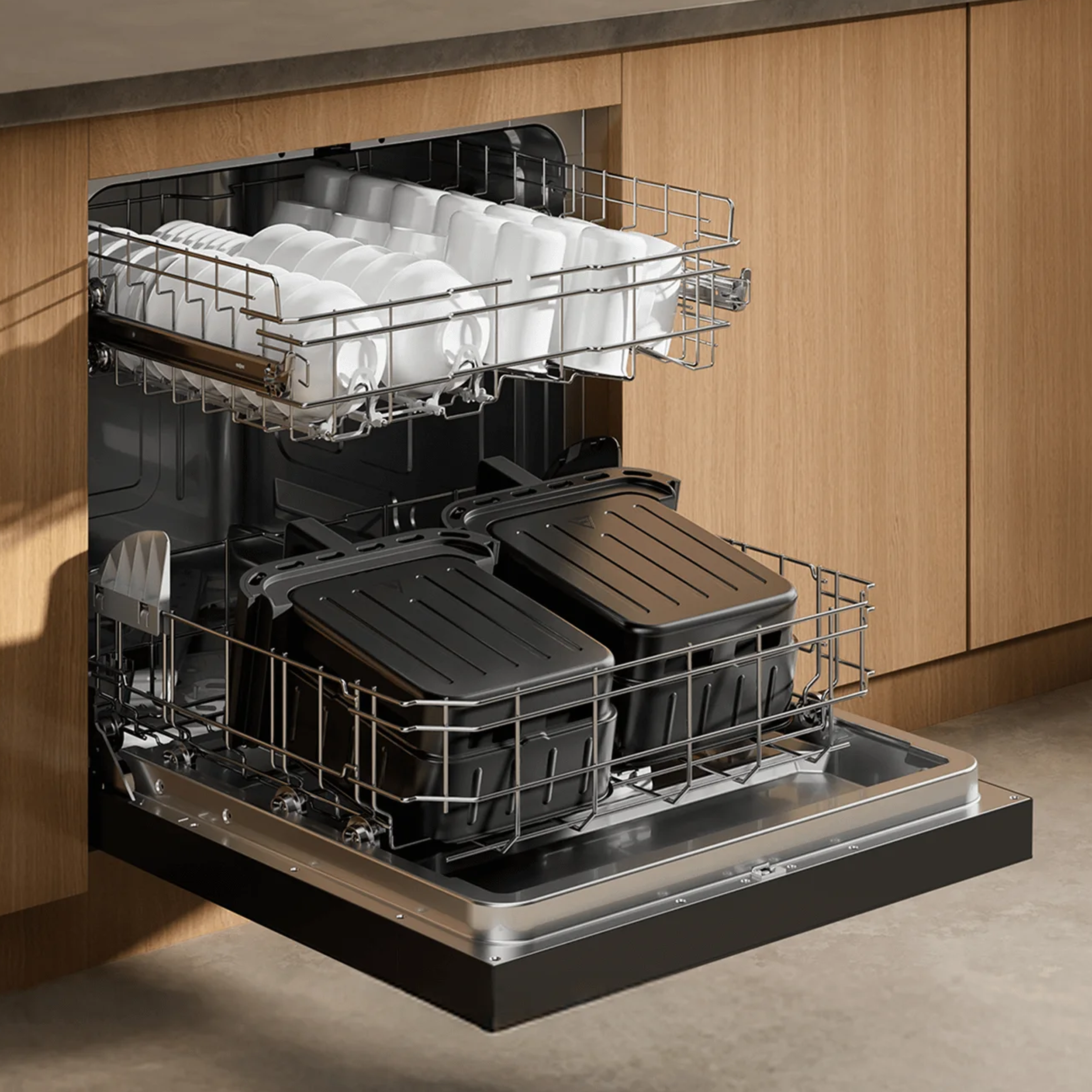 Košare in dodatki imajo nelepljivo prevleko ter so primerni za pranje v pomivalnem stroju, kar bistveno olajša čiščenje po uporabi. Vgrajeni varnostni sistemi, kot so zaščita pred pregrevanjem in samodejni izklop ob odstranitvi predala, zagotavljajo brezskrbno uporabo.