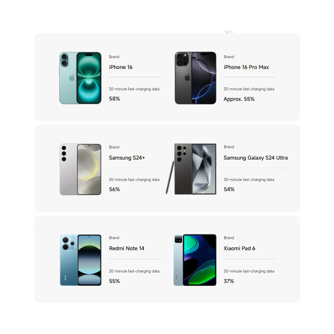 Pametni vgrajeni čip samodejno prepozna priključeno napravo in prilagodi izhodno moč. Polnilnik podpira QC, PD in PPS protokole hitrega polnjenja, zato ni optimiziran le za Xiaomi in Redmi naprave, temveč je združljiv tudi s številnimi drugimi blagovnimi znamkami, kot sta Apple in Samsung. En polnilnik tako zadostuje za večino vaših naprav.