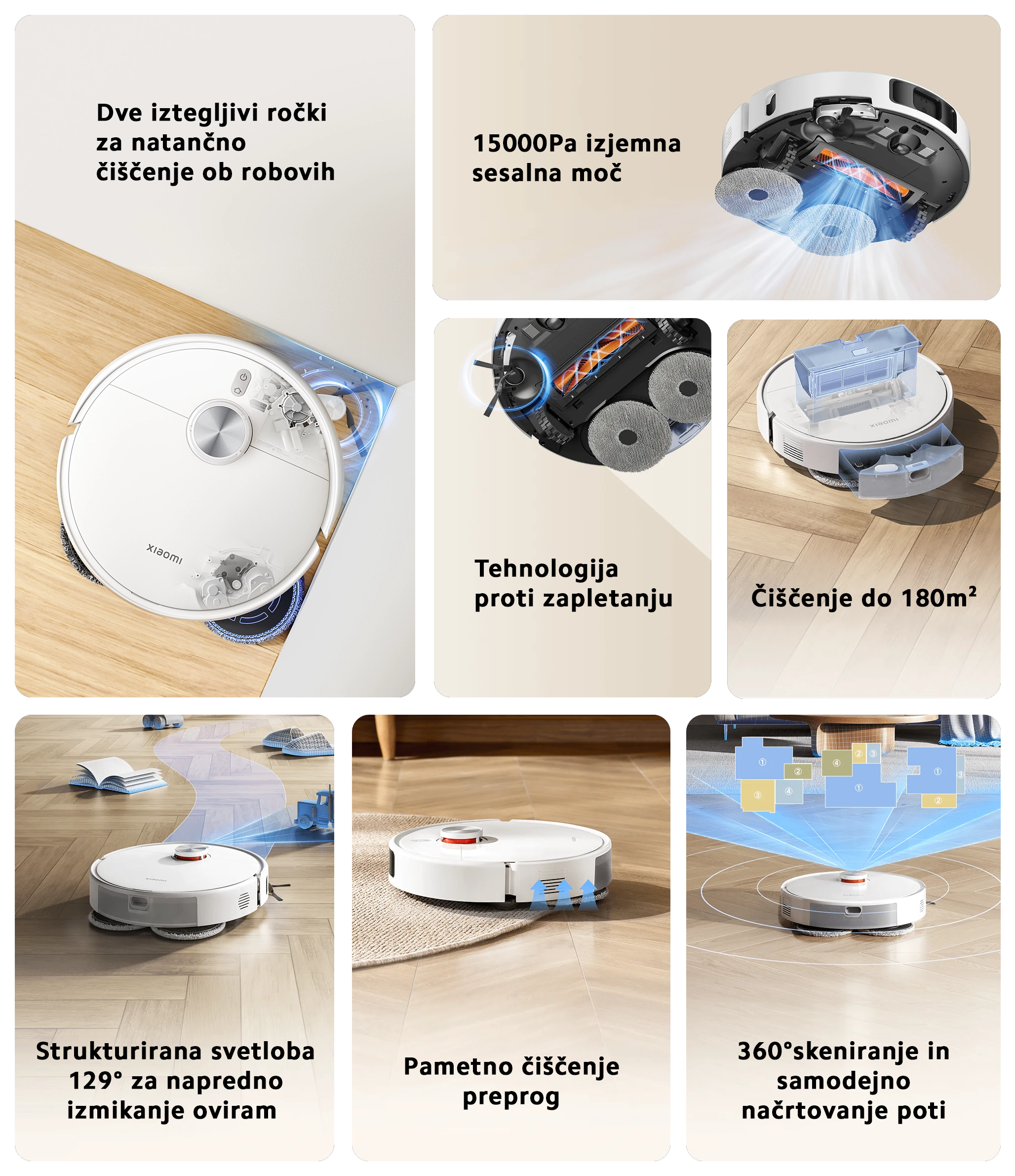 Dinamično pomivanje robov do 1 mm: Podatki izvirajo iz notranjih laboratorijev Xiaomi. V laboratorijskih pogojih testiranja je bila pri pomivanju ob robovih izmerjena razdalja med razširjeno krpo za pomivanje in steno, ki ni presegala 1 mm.