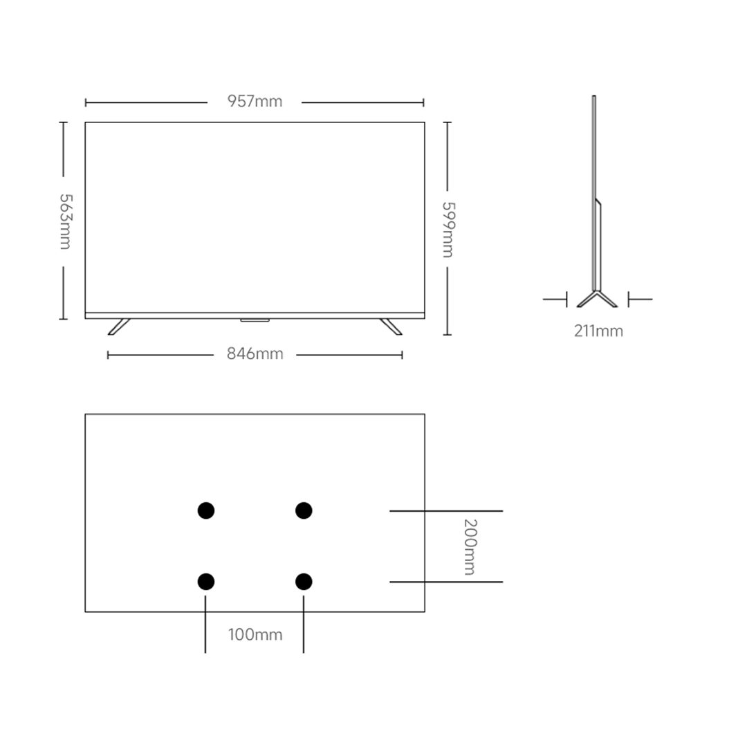 TV ima kovinski okvir in dvojno stojalo v barvi Dark Gray, kar zagotavlja stabilnost in premium videz. Dimenzije brez stojala so 957 × 72 × 563 mm, z osnovo pa 957 × 211 × 599 mm. Teža znaša 5,9 kg brez stojala in 6 kg s stojalom. Podpira stensko montažo 100 × 200 mm.